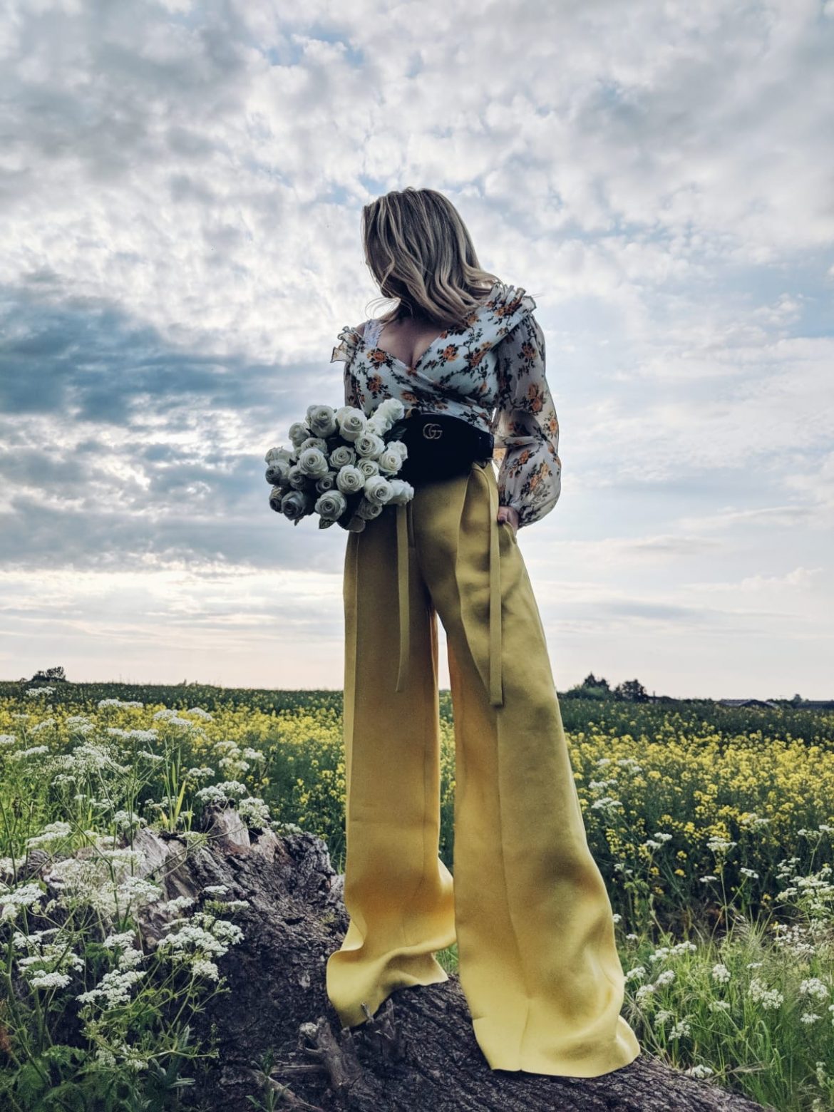 I love wearing suits or trousers for weddings so of course, I included a trouser look. To make the trousers suitable for the dress code with a hint of glam, I went for oversized yellow wide leg trousers. They are such a statement but that is what I wanted and what I advise. If you are going to wear trousers to a wedding make it count – you don’t want to look like you’ve just come from a big important meeting in the City! I styled the trousers with a crop top. I know that sounds alarming but styled with high waist trousers it’s a winner.