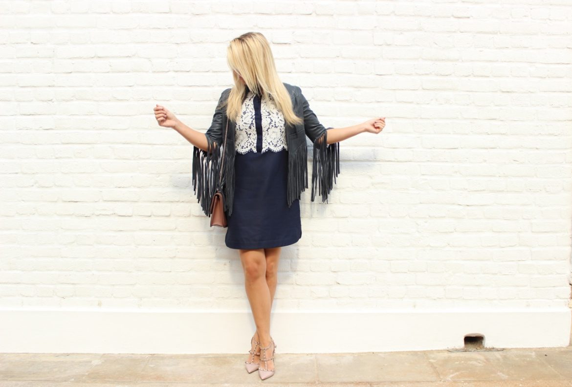 This dress is really similar to a Valentino one I loved that Sandro brought out last season. I loved the Sandro version but even that was a bit pricey. This dress was £50, such a bargain for such a pretty and practical dress. I paired it with a leather, fringed, navy jacket to match the navy dress and to show you you don’t have to wear a typical office blazer. The leather jacket adds a trendy edgy look and great for throwing on if you want to go out after work. I showed you how it looks with flats and heels so you can take or leave the heels.